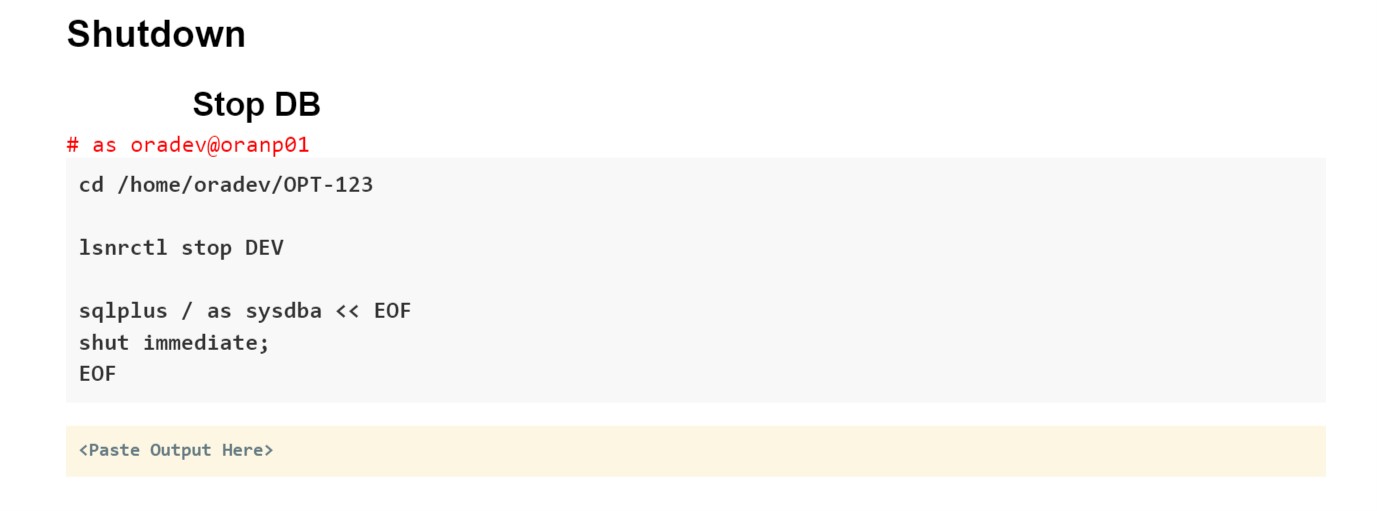 Of course, with our organizational emphasis on reliable, repeatable work, we have been creating action plans for our maintenance activities for a long time. Usually, this is a multi-step process:- The preliminary action plan for the maintenance is created by a DBA who takes into consideration the current state of the system and the change that needs to be applied. The DBA studies documentation and relevant My Oracle Support notes to determine the right sequence of actions.