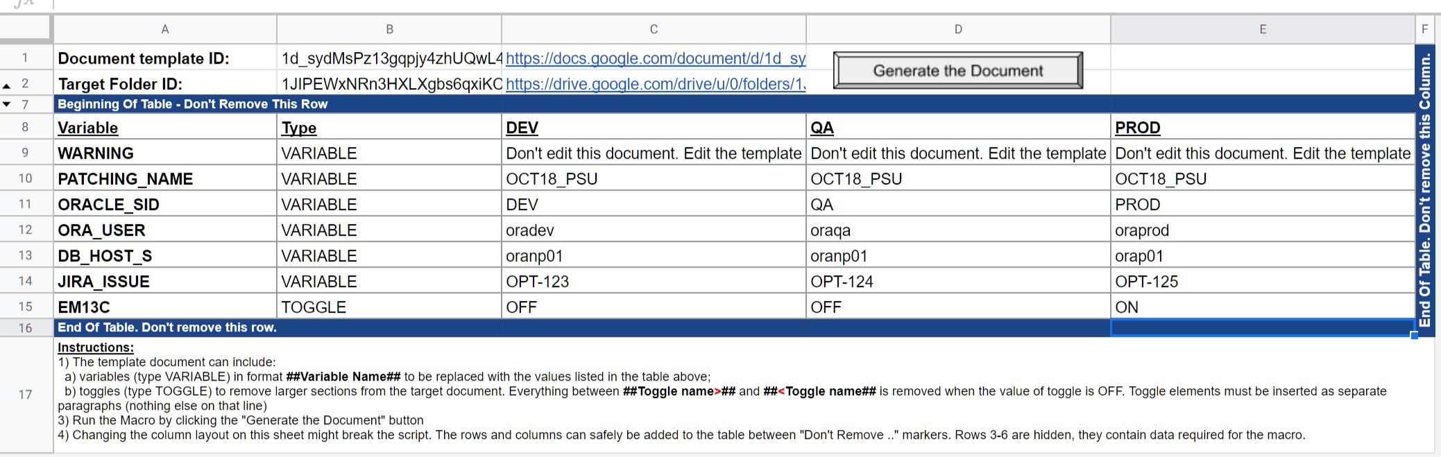 ##DB_PORT##" placeholder instead of port 1521. We also include "toggles" to be able to enable/disable complete sections of the document. - All the values for placeholders for every environment that needs to be maintained are defined in a separate spreadsheet that is compact and easily manageable.