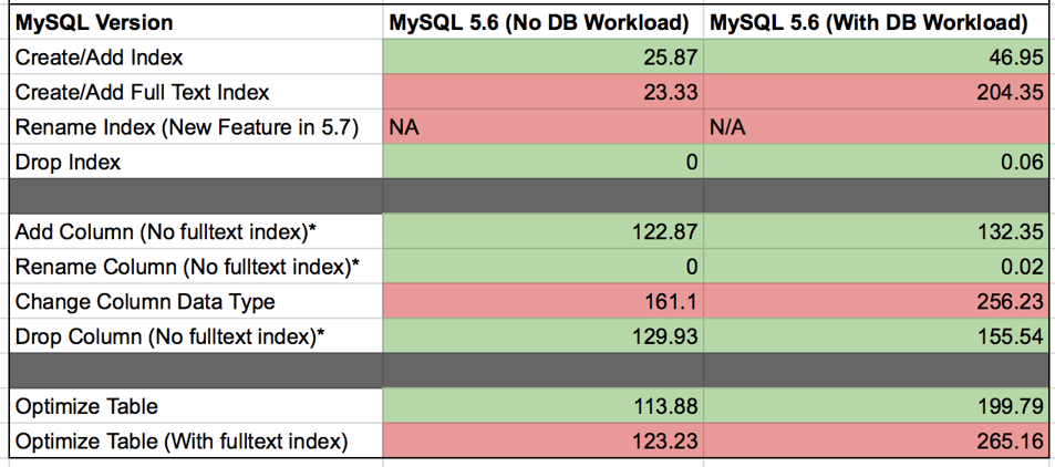 This matrix is a representation of the testing that I performed and how quickly the commands took to execute. Be careful with Fulltext indexes on your tables since they potentially can cause additional locking by creating the necessary infrastructure in the background. Please see MySQL Innodb Fulltext Indexes for more details. This requirement causes a great deal of locking on the table.