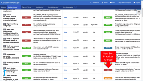Oracle Health Check Collections Manager is an APEX companion application to Oracle EXAchk that gives you an enterprise-wide view of your health check collection data. All you need to have is an APEX 4.2 or 5 version and deploy the tool. The main idea is that you can consolidate all your reports in one place and, as a plus, manage all your EXAchk reports across time, including a view of any items regression you might have.