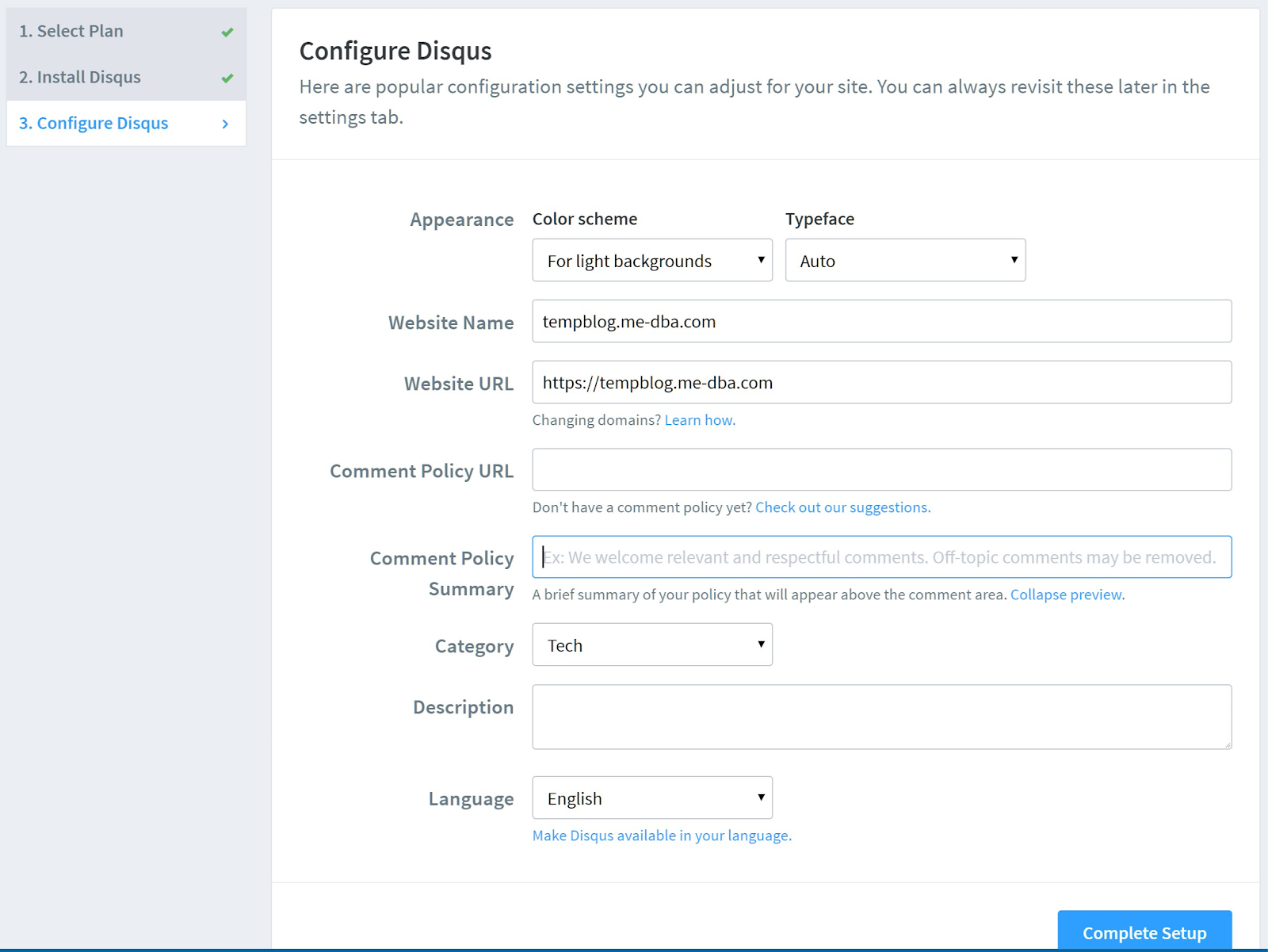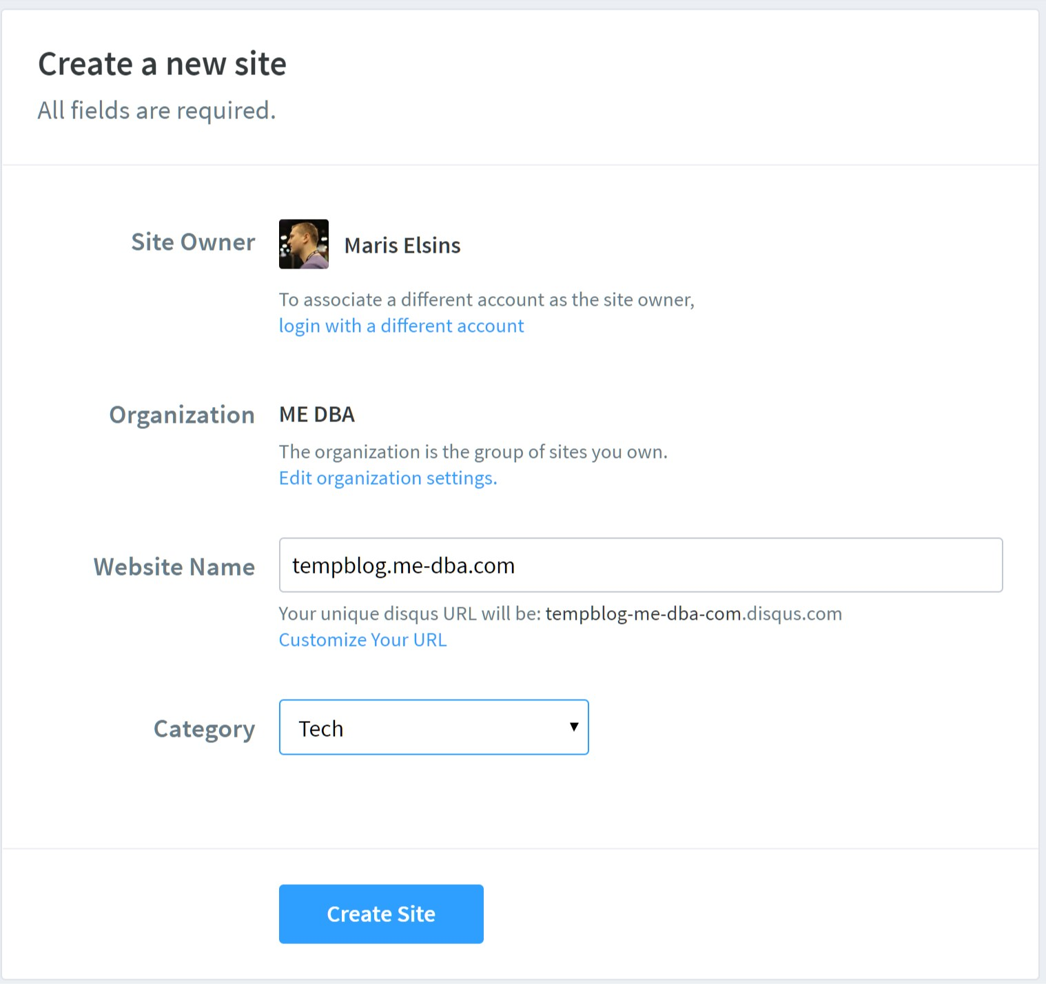Native support for the Disqus comment platform will depend on the theme you choose for your blog. In this case, I used the default theme called minima-2.5.0 that already includes the required code to add the Disqus comment threads. I think many themes already include this code, but it's not really complicated to customize other themes to add the required code too. Before adding the comment sections to the blog posts, the new site needs to be registered in the Disqus platform. Go to https://disqus.com/admin/create/ (register a new user if you don't have one yet), and follow these steps to register your new site:- Choose a name for your site, note the unique Disqus URL as its first part is the Disqus shortname that will be required later in Step 4 (in this case it's "tempblog-me-dba-com"): [caption id="attachment_106243" align="aligncenter" width="1518"]