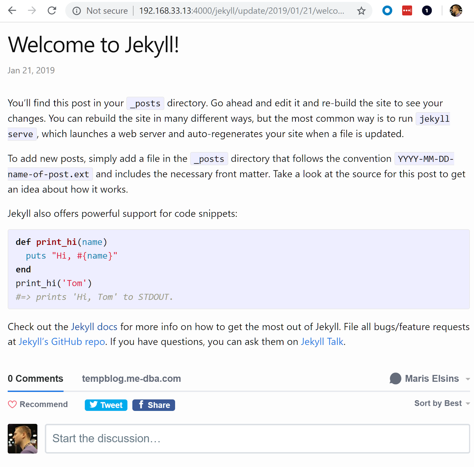 - At this point, the blog should be accessible on the Docker host ip, port 4000. In my case the IP was 192.168.33.13, so the following two URLs served the demo pages included in the new blog structure (in your case the IP may differ): https://192.168.33.13:4000/ is the front page of your blog.