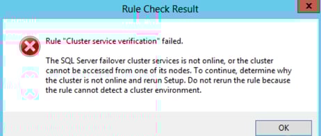 The first issue you may run into is during the Setup Support Rules step of the SQL installation wizard. The Cluster Service Verification Rule fails, saying that the SQL Server failover cluster service is not online or cannot be accessed:
