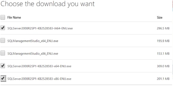 - Download all 3 SQL Server 2008 R2 SP1 packages from https://www.microsoft.com/en-us/download/details.aspx?displaylang=en&id=26727.