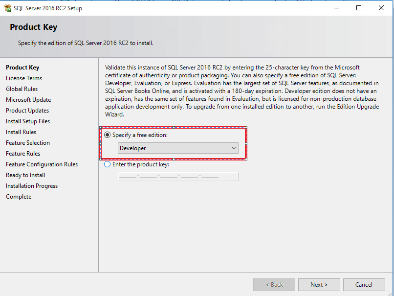 - Select the edition of SQL SERVER you would like you would like to install, I chose developer as it’s a full featured installation of SQL Server that can be used for development only, and not in a production environment. You could also enter a key in here instead of selecting a version.
