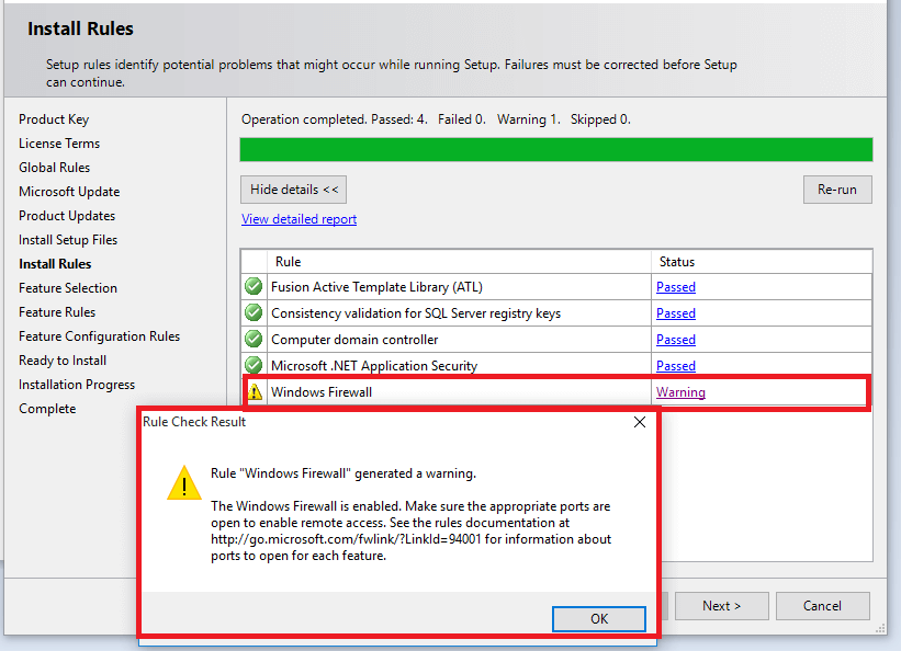 - SQL Server Installation will then install some setup files needed for installation and perform a few more checks. As you can see below, a warning has appeared asking me to make sure the correct ports are open on the firewall. Click Ok and then Next to proceed with the installation.
