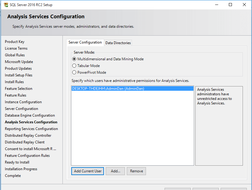 - The next screen is to configure Analysis Services. I have configured mine in Multidimensional mode adding myself as sysadmin and setting directories using same best practice as database engine. Look out for a further blog article on SQL server Analysis Services.