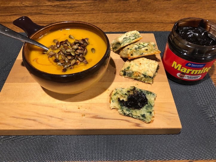 It’s not nachos, but perfect for winter: Miso spinach and cheese scones, and Marmite, a New Zealand icon.