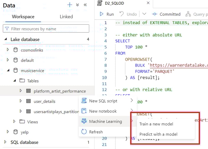 In addition, the Synapse user experience team has added highly accessible GUI options that lead the user through training a model or scoring with a trained model with Azure ML directly from the Synapse workspace environment: