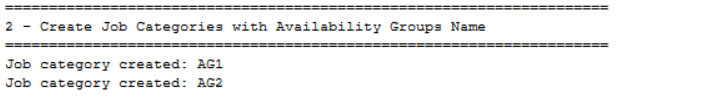 Script Output: Job categories created with the same name as the Availability Groups:   3 - Assign Availability Group Name Category to each SQL job that uses a database in an Availability Group.
