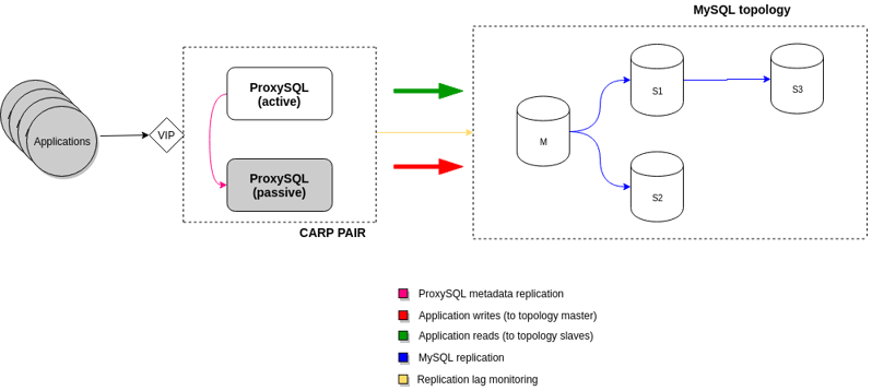 When designing a highly-available MySQL architecture, having a proxy to route the traffic to the appropriate instances is crucial to achieve transparent (or almost) failovers/switchovers. ProxySQL, a popular open source, SQL-level proxy is a great choice for this, and even though an experimental clustering feature is available, we could follow a simpler active-passive approach too, based on Common Address Redundancy Protocol (CARP), which will also provide a highly available IP for the applications to connect.