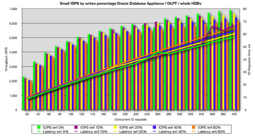 Before I stress test an IO subsystem, I usually set some expectations. Let's do the same here. ODA has 20 disks - 15K RPM SAS disks. My experience tells me that I should expect very good single IO latency (below 10ms) from these disks serving at least 100 IOPS each. I also expect that these disks will still provide reasonable response time if you crank up the workload to about 200 IOPS but this is where I would see much higher response times -- getting into 20ms range. Now, I know that 15K RPM SAS disk can deliver even more IOPS each but then IO response time becomes generally unacceptable for OLTP systems. In fact, 10 ms target is what's been a good rule of thumb in the last decade. I try to perform perform IO stress tests with different percentage of writes to see the impact of the write activity. This is useful when I assess IO capacity for a particular application where I can predict IO patterns or measure the existing pattern. Again, I have certain expectations here. For RAID5, RAID-DP, and all kind of other RAID-F levels that use parity one way or another, I expect that sustainable IOPS level to drop significantly as write activity becomes more dominant. No matter what magic solutions vendors implement, sustained IOPS always drop or so I've seen until now.