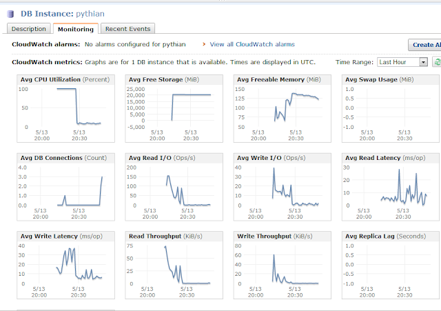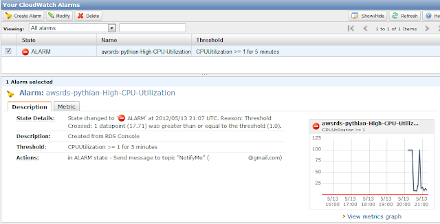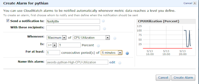 – There are also an alerts functionality to setup alerts for the above monitored metrics in case any of them crossed a value. I created a test alarm to page if CPU usage crossed 1% for more than 5 minutes, a guaranteed firing alert just for testing.