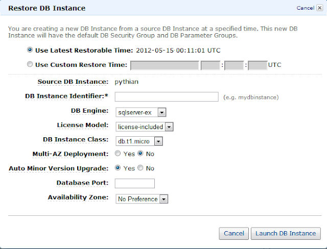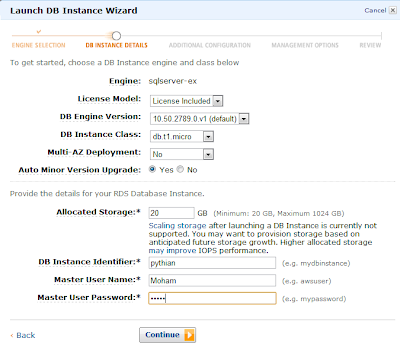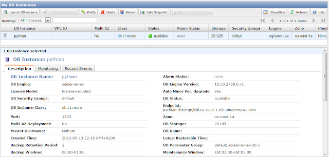 After that, you can use the AWS management console to launch and manage your instance. The setup is truly simple and asks for few parameters to fill. You have no control on the location of database files, instance collation, instance name, or admin accounts.