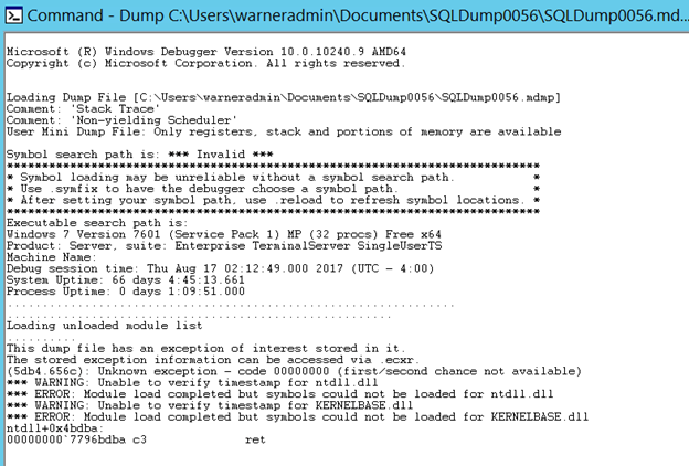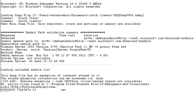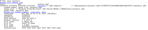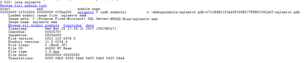 We can see in the output that indeed there is a match found in our symbols for the module mentioned in the dump, in this case, the main SQL Server executable sqlservr.exe. It also provides the exact version information for SQL Server. For example, the above screenshot identifies version 11.0.6594 which is SQL Server 2012 Service Pack 3, cumulative update #4. Of course, you can always get the information from the server itself, but if all you have is the file available, then this is an alternative way to get it. Knowing the exact version information is important since the dump could have been generated by a bug that is specific to a version. -