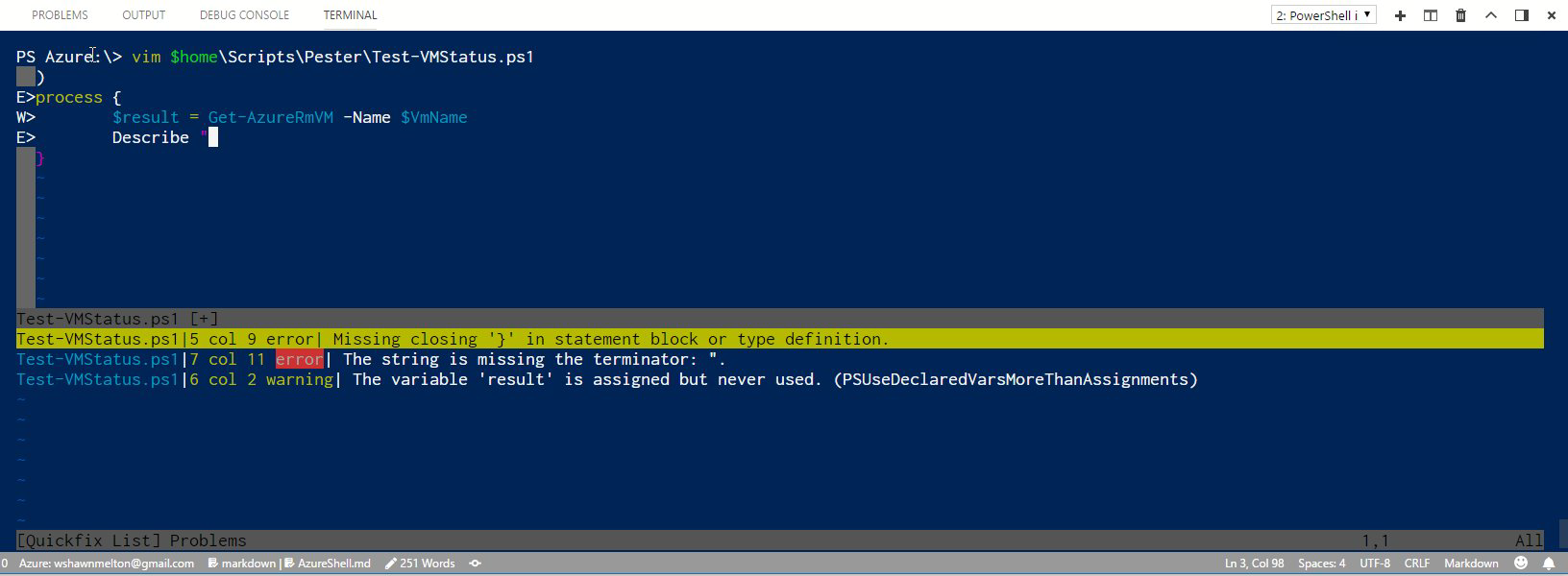 Outside of just PowerShell and PowerShell modules Microsoft has provided other tools that can be used for automation or simple convenience. You can see from the screenshot below the container has Python and Git. One thing that threw me a bit was when I saw Vim is available...Who does not love Vim? [caption id="attachment_103875" align="aligncenter" width="811"]