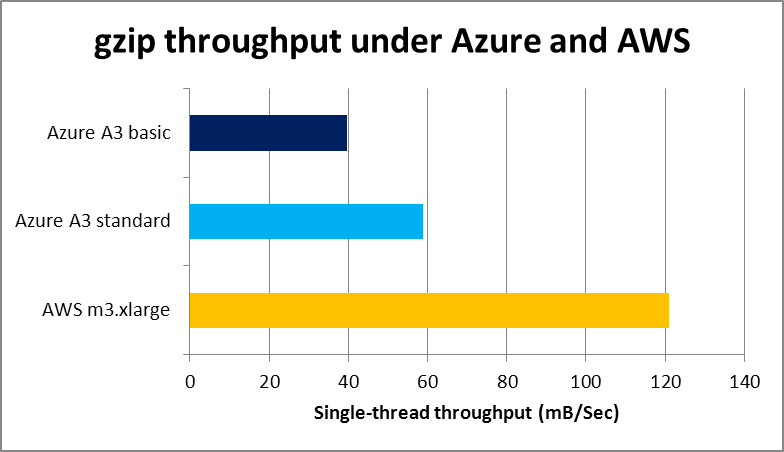 Under Azure, we simply aren’t getting a full physical core’s worth of throughput. Perhaps the hypervisor is capping throughput, and capping even lower for basic instances? Or maybe the actual CPU is different than the E5-2660 reported? For integer CPU-bound workloads like our gzip test, we would need to purchase at least twice as much capacity under Azure than AWS, making Azure considerably more expensive as a platform.