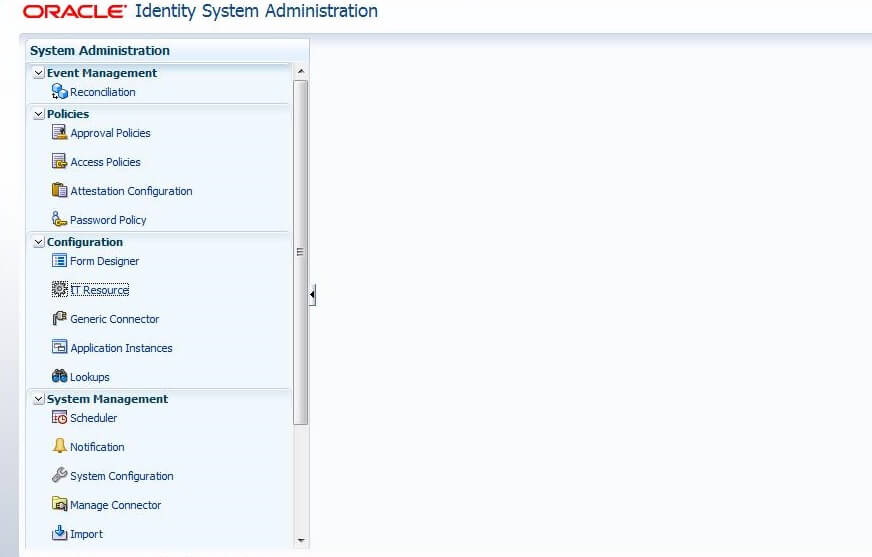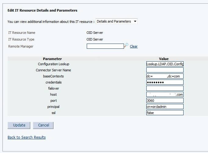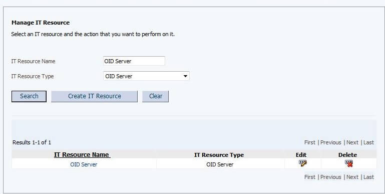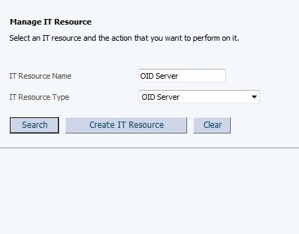 Configure IT resource for the Target System. IT resource name: OID Server IT Resource type: OID Server Configuration Lookup: Lookup.OID.Configuration Connect Server Name : <leave blank=''> baseContext : "dc=<client domain>,dc=com" (Note: Make sure you put the base context in quotes) credentials : **** failover : <blank> host : <oid host=''> port : <oid port> principal : cn=orcladmin ssl : false