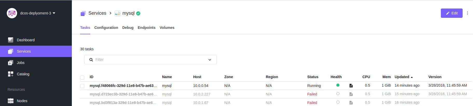 Finally, even though you could deploy a stand alone database instance as described here, Galera cluster may be a better choice for running MySQL on DC/OS (as explained in this Percona Live 2018 session).