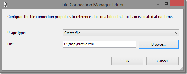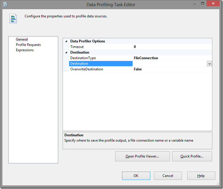 Step 4: Double click in the Data Profiling task so we can configure it. In the General tab we have to set the Destination, that means, the location you want to save the XML file. You can choose to save directly to the file system using a File Connection or store in a XML variable inside your package in the case you want to do something else with the XML, maybe store in a database. Let’s leave the default FileConnection option for the Destination Type option and click in New File Connection in the Destination option.