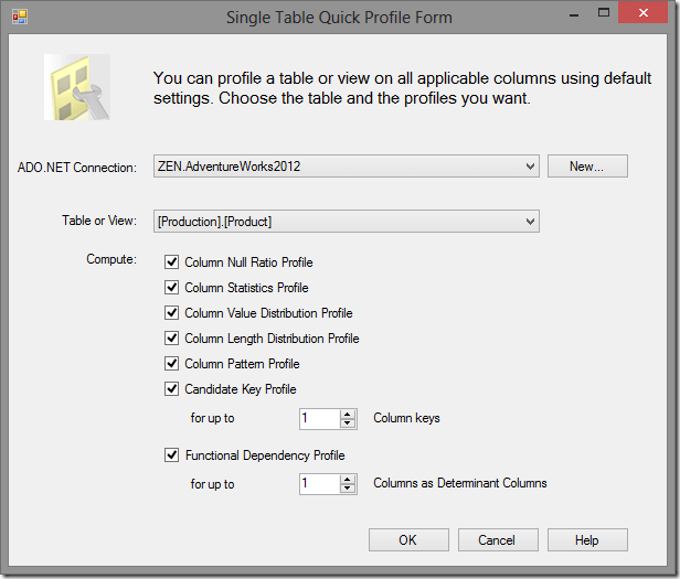 Step 6: Ok, we’re back to the main window, we have now to choose which kind of analysis we want to run, the database and the table. We have two options, the first one is to use the Profile Requests tab and choose one by one the data analysis, table and columns. The other option and also the simplest one is to use the Quick Profile tab. Using this option we can define one specific table and what analysis you want to run on that table. If you want to run the analysis on multiple tables you will have to click in the Quick Profile option and choose one by one (nothing on this world is perfect).