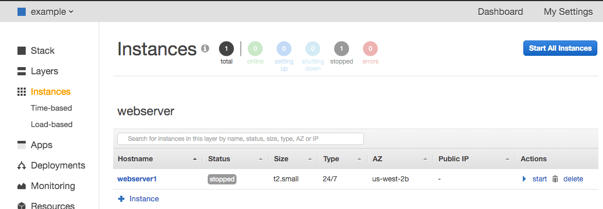 We have three different types of instances on Opsworks: 1. 24x7x365 Run with no stop 2. Time based Run in a predefined time. Such as work hours. 3. Load based Scale up and down according to the metrics preconfigured. You can find more details here.Custom JSON