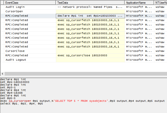 I want to first show you what the capture appears like in Profiler. I setup a basic trace in Profiler that uses the "Standard (default)" template, and then added in two additional events: CursorOpen and CursorClose. I execute the script above, just using a count of 5 this time, and the output from Profiler shows this information: xe_api_cursor_profiler Pretty standard to what most folks are used to seeing, the only way to see the query is that first rpc_completed event. As you can also see the cursor event classes show nothing in the text_data value.