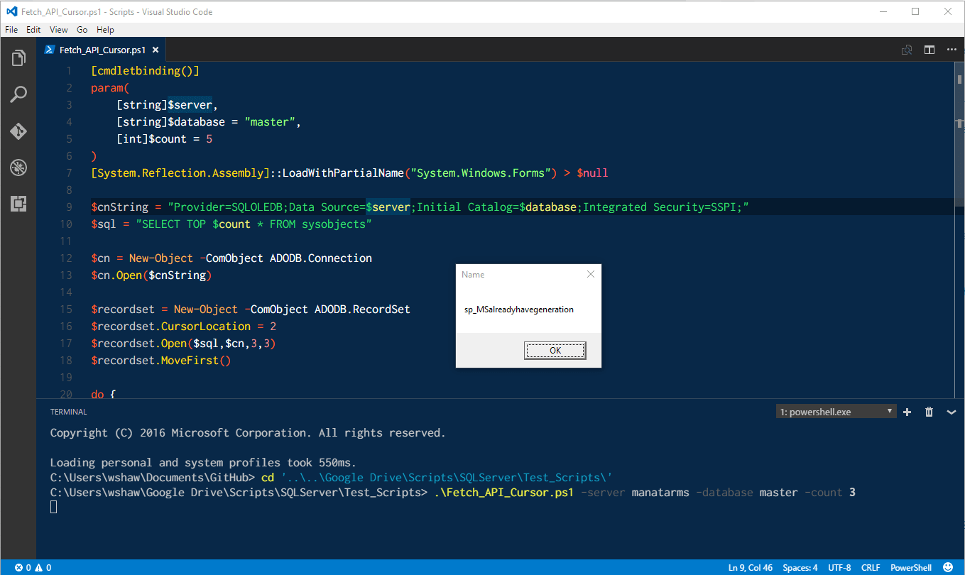 When you run the script a message box will show the name of the "sysobject" returned, clicking OK will iterate through the number based on the count value provided. You can adjust how many are returned using the `-count` parameter. xe_api_cursor_psscript