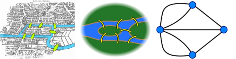 Graph theory actually dates back to the mid eighteenth century when mathematician Leonhard Euler set out to solve the Seven Bridges of Konigsberg math puzzle which described several islands and a land mass divided by two rivers and connected by seven bridges. The problem required one to find a route to every land mass by only crossing each bridge once. Short answer is you can’t; you need an even number of bridges. (You can learn more about this particular problem here).