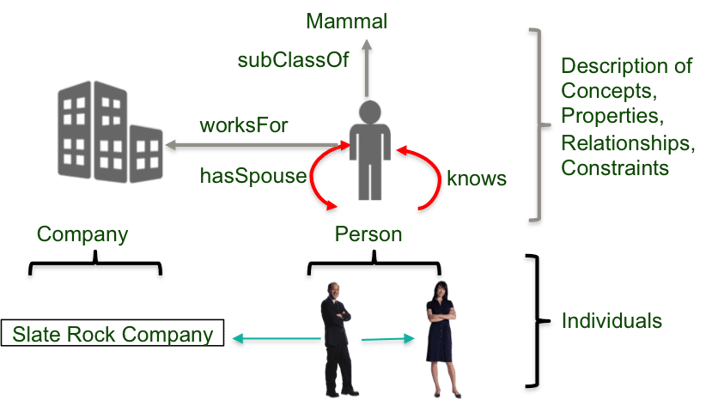 RDF has similar concepts as object-oriented models where one defines classes of entities, and the instantiation of a class is an object, e.g. Bob is an instantiation of a person class, which is a sub-class of mammal.