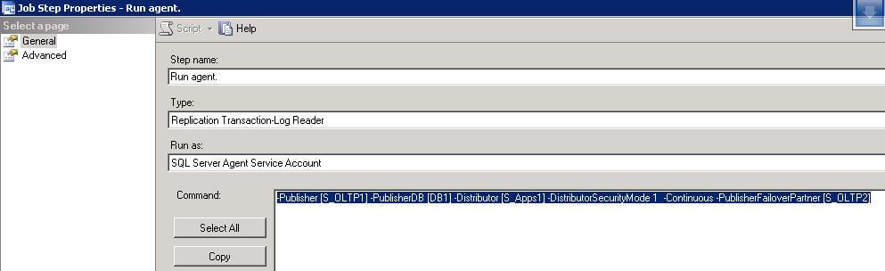 Click OK, and voila! The log reader agents for this project are all set for automatic failover. Alternatively, we can also customize automatic failover for specific agents by just modifying Agent job parameters. To achieve this, simply open the properties and modify the job step “Run agent”. Figure 23 shows how it should be put in. We will simply add the parameter “-PublisherFailoverPartner” to the command. A typical command parameter-set will look like this: “ -Publisher [S_OLTP1] -PublisherDB [DB1] -Distributor [S_Apps1] -DistributorSecurityMode 1 -Continuous -PublisherFailoverPartner [S_OLTP2]” The underlined portion is what we need to add to the job. This is how it will look once complete: Figure 23: AgentJobProperties That concludes the failover configuration for publishers. Now we can proceed with adding subscribers normally. Since, there is no configuration required at subscriber end, to configure publisher-failover scenario, we can proceed with adding subscribers normally. And, there we are, with the project successfully implemented! Food for thought: Although, we have wonderfully configured publisher failover, this is not a fully established topic and needs some more exploration and discussion. Clearly, not all types of replication setups support publisher-failover. It would be interesting to note which ones. Moreover, we are talking about two major techniques combined! It increases possibilities and options, but it also introduces some challenges to be dealt with. Replication is highly robust, but what if mirroring breaks, or simply, the principal server is unavailable for some time? We sometimes rely on Replication Monitor, and would also love to think that it provides a complete picture of Replication state – even when mirrored!