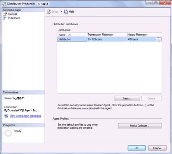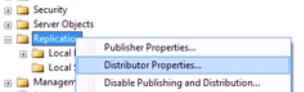 1. Connect to the distributor. Right click “Replication” and select “Distributor Properties” from the context action menu. See Figure 15 below.Figure 15: AgentProfile_Step1