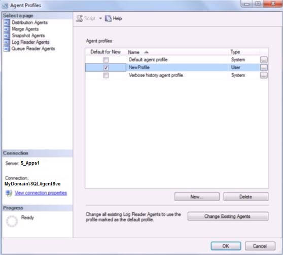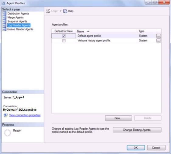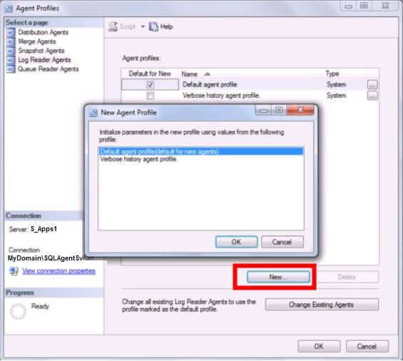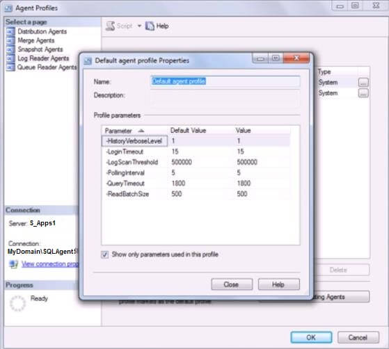 Once we have the publication in place, we are done with setting up Distributor, Publishers and the Publication. Next step up will be to configure the agents to failover. Let’s discuss what needs to be done to make the replication agents to recognize the failover partner. There are a few ways we can do it: a) Modify agent profile to change the “PublisherFailoverPartner” property, using Distributor properties dialog box. b) Modify agent profile to change the “PublisherFailoverPartner” property, using TSQL. c) Modify each agent’s job individually, to add the parameter “-PublisherFailoverPartner”. The difference between changing agent profiles and agent job properties is that by changing profile, we can alter the behaviour of all publisher side agents. By changing the job properties, we only affect those agents whose job is modified. We will look at options A and C in this blog post. To modify agent profile using Distributor properties, we will go through the following steps: