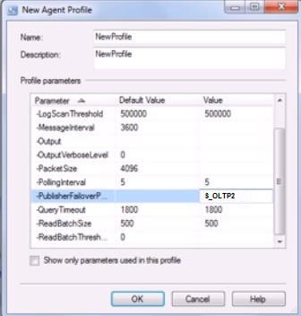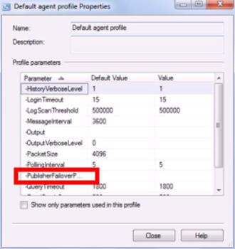 5. By default, the dialog box shows only the properties that are configured. To see the complete list, including the property we are interested in, uncheck the Check box “Show only parameters used in this profile”. Figure 19 shows what the screen looks like. Profile property “PublisherFailoverPartner” is highlighted in the snapshot below.Figure 19: AgentProfile_Step6