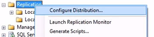 1. To setup a common remote distributor, we will connect to S_Apps1 server, using SSMS. Once connected, expand the server and right click on Replication and select “Configure Distribution…” from the context action menu. See figure 2 below. Figure 2: ConfigDistributor_Step1