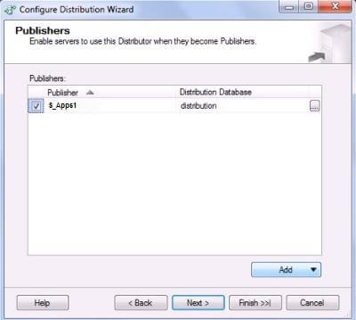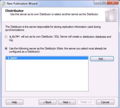 1. In the “New Publication Wizard”, when selecting distributor, choose to use remote distributor. Click Add and connect to the distributor configured in the steps above. The “Distributor” screen of “New Publication Wizard” will look something like Figure 13 below.Figure 13: NewPublicationRemoteDistributor_Step1