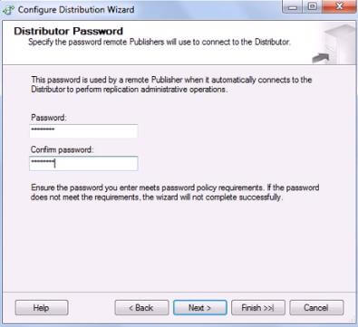 2. On the next screen, we will specify the password that we provided while configuring the distributor for “Distributor Password” – refer Step 7, in configuring Distributor steps above. The wizard screen to specify the password will look like Figure 14 below.Figure 14: NewPublicationRemoteDistributor_Step2