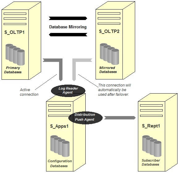 • S_Apps: The original middle tier server. (This will also be used as replication Distributor. Optionally, this server could be used as a Witness server for the mirrored pair of S_OLTP1 and S_OLTP2.)