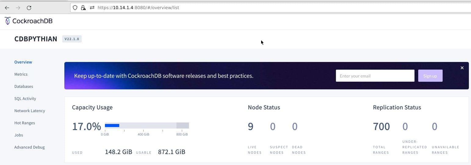 root@cdb-cluster-node1:/cdb# cockroach init --certs-dir=certs --host=10.14.1.4 --cluster-name="CDBPYTHIAN" Cluster successfully initialized