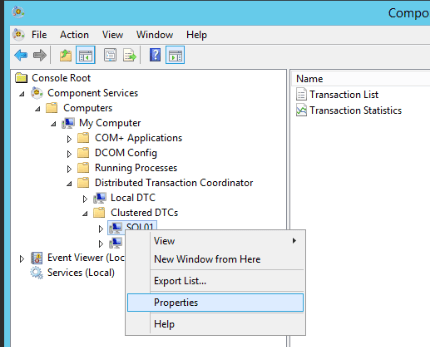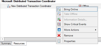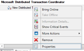 - The resource will be created in the selected Role, now we need to configure it. Right-click the "New Distributed Transaction Coordinator" and click on "Properties".