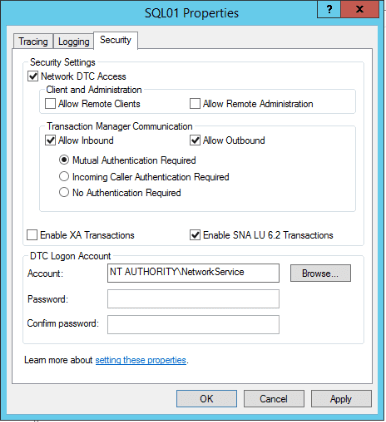 - Go to the "Security" tab and check "Network DTC Acess" as well as "Allow Inbound" and "Allow Outbound", as shown bellow. Click Ok.