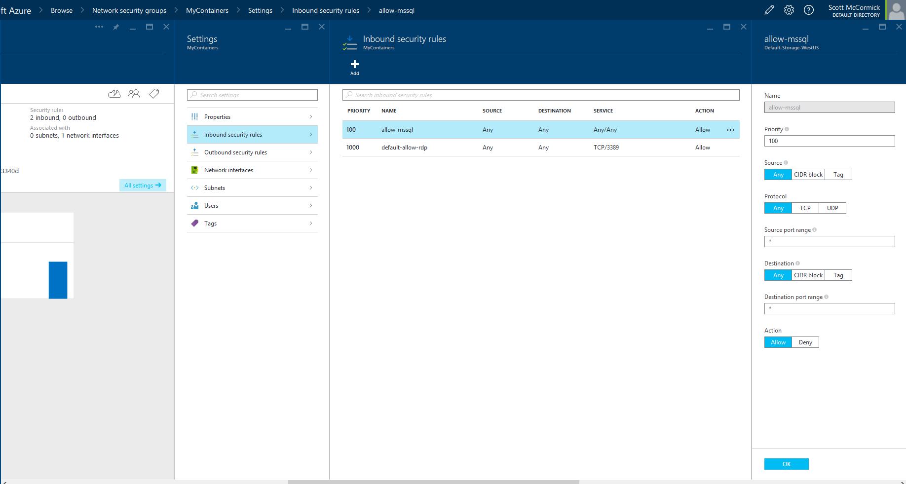 Run the following in Powershell on your host to open the right ports. I'll be using the default port 1433:if (!(Get-NetFirewallRule | where {$_.Name -eq "SQLServer 1433"})) { New-NetFirewallRule -Name "SQL Server 1433" -DisplayName "SQL Server 1433" -Protocol tcp -LocalPort 1433 -Action Allow -Enabled True }