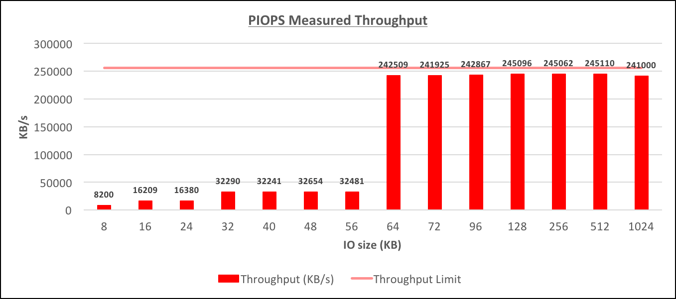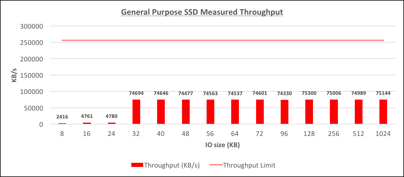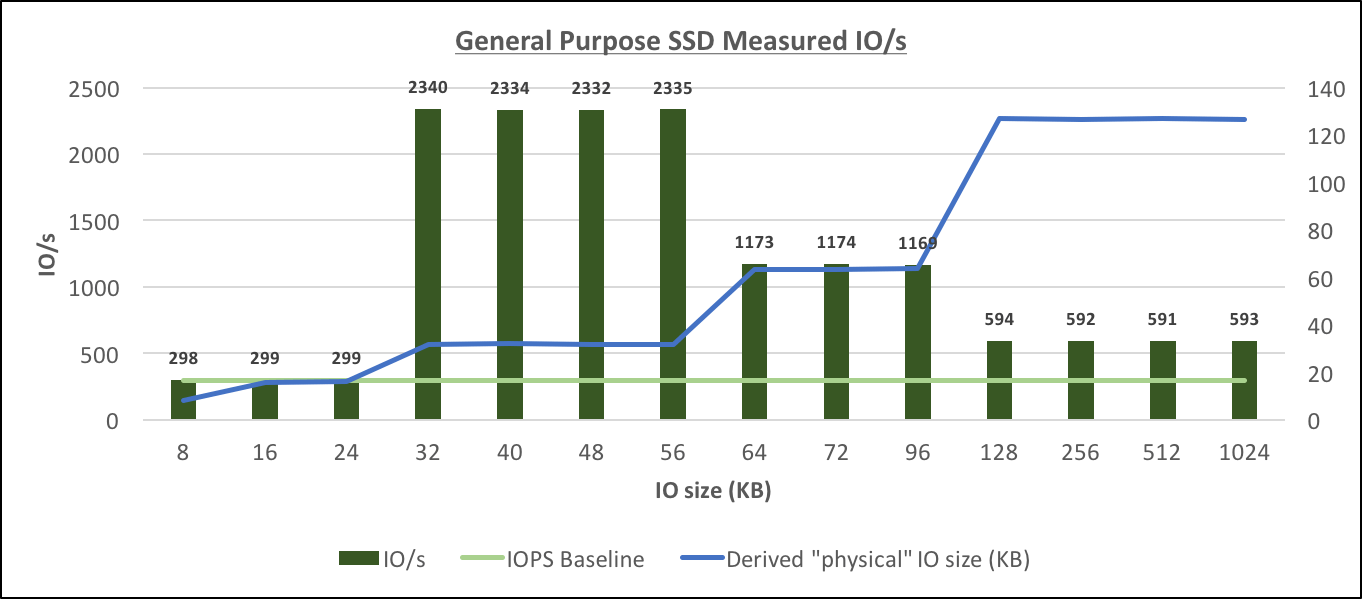 - The IOPS limit applies only to smaller physical IOs sizes (up to 32K), for larger physical IOs (64K, 128K) the throughput is the limiting factor of the IO capability. The throughput limit appears to be quite close to the maximum throughput that the instance is capable of delivering, but at this point, it's not clear how the throughput limit for particular situation is calculated.