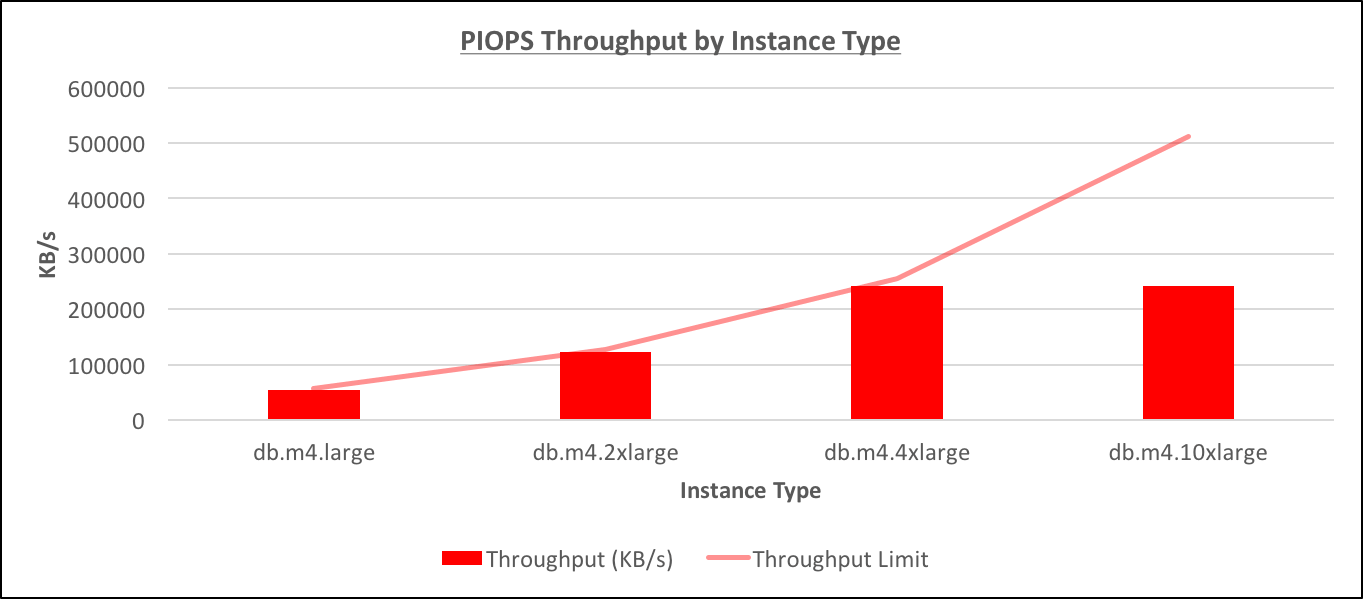 PIOPS Throughput by Instance Type[/caption] it appears that the maximum throughput is indeed limited by the instance type, except for the very largest instance db.m4.10xlarge (For this instance the situation is somewhat weird even in the documentation because the maximum throughput is mentioned as 500 MB/s, but the maximum throughput for a single io1 EBS volume, which should be there underneath the RDS, is just 320 MB/s, and I was unable to reach any of these limits)