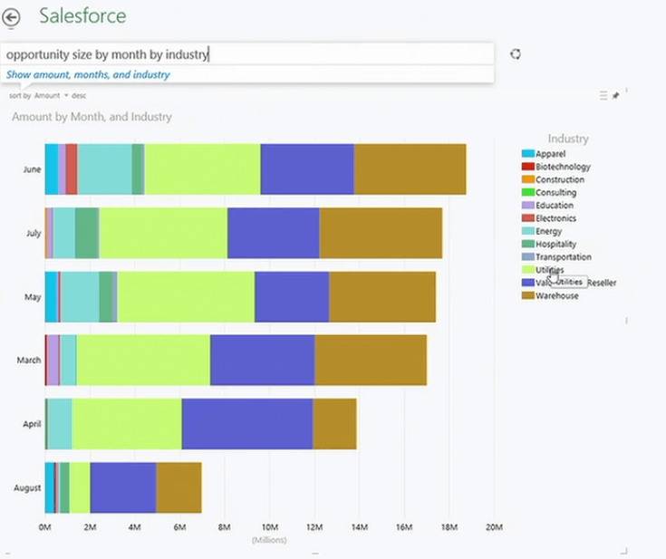 The biggest advantage is the PowerBI Q&A, as you can see in the screenshot in every screen we have a simple search box at the top of the page, which allows the user to do simple natural language questions to query the data. So, if the user wants to know the “opportunity size by month and by industry” all you have to do is ask and PowerBI will find the data, and choose the best visualization method for you. After that, you can just pin this report in the dashboard and that’s it, now you can keep track of this important information on a daily basis. Without requiring a single line of code, without asking for a change request to the IT department and going to a huge queue of requests that would take months to be addressed.