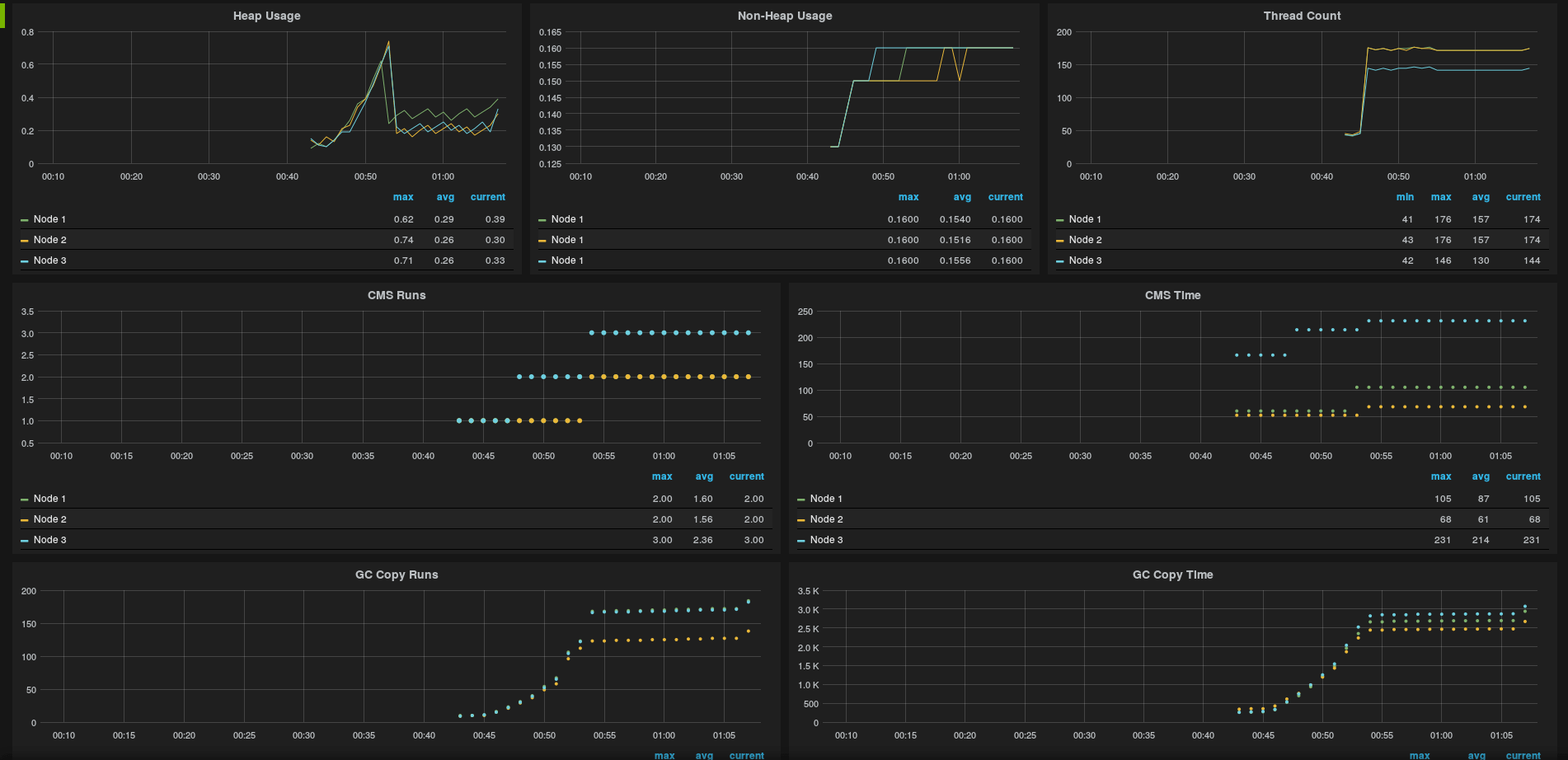 Now the final piece of the puzzle. Now we follow more or less the Cassandra guide that exists here, but we need to make some changes to make it more valuable (and allow multiple nodes to provide metrics). So, first of all, put the metrics-graphite-2.2.0.jar in all the Cassandra nodes /lib directory. Now create a yaml file with similar to the Datastax example, lets call it influx-reporting.yaml and store it on /conf directory. Now edit the file again so it looks like this: [code] graphite: - period: 60 timeunit: 'SECONDS' prefix: 'Node1' hosts: - host: 'localhost' port: 2003 predicate: color: "white" useQualifiedName: true patterns: - ".*" [/code] What did we change here, first we added a prefix field, this will allow us to identify the node that is providing the metrics. It must be different for every node, otherwise the metrics will overwrite/mix with each other. Then we decided to allow all patterns (".*"), this means that Cassandra will push out all the metrics into influxDB. You can decide whether or not this is too much and just enable the metrics you want (find out more about it here). Now edit the cassandra-env.sh so that it will read the yaml file to provide the metrics. Add the following line to the end of the file: [code] JVM_OPTS="$JVM_OPTS -Dcassandra.metricsReporterConfigFile=influx-reporting.yaml" [/code] If all is done correctly, you can restart the Cassandra node (or nodes, but don't do it all at the same time, 2min between each is recommended) and if the log file has the following message: [code] INFO [main] YYYY-MM-DD HH:MM:SS,SSS CassandraDaemon.java:353 - Trying to load metrics-reporter-config from file: inf lux-reporting.yaml INFO [main] YYYY-MM-DD HH:MM:SS,SSS GraphiteReporterConfig.java:68 - Enabling GraphiteReporter to localhost:2003 [/code] All is good!Graphing!