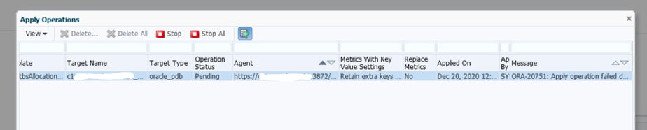 oracle:dbserver01@c1test1 /u01/app/oracle: /u01/app/oracle/product/agent12c/core/12.1.0.5.0/bin/emctl control agent runCollection c1test_CDBROOT:oracle_pdb tbspAllocation Oracle Enterprise Manager Cloud Control 12c Release 5 Copyright (c) 1996, 2015 Oracle Corporation. All rights reserved. --------------------------------------------------------------- EMD runCollection completed successfully oracle:dbserver01@c1test1 /u01/app/oracle: /u01/app/oracle/product/agent12c/core/12.1.0.5.0/bin/emctl status agent scheduler | grep tbspAllocation 2020-12-28 23:05:14.562 : rac_database:c1test:tbspAllocation_cdb 2020-12-29 03:07:21.988 : rac_database:c4prod:tbspAllocation_cdb 2020-12-29 03:08:11.888 : rac_database:c6prod:tbspAllocation_cdb 2020-12-29 03:09:39.103 : rac_database:c2prod:tbspAllocation_cdb 2020-12-29 03:09:55.372 : rac_database:c3prod:tbspAllocation_cdb oracle:dbserver01@c1test1 /u01/app/oracle: /u01/app/oracle/product/agent12c/core/12.1.0.5.0/bin/emctl control agent runCollection c1test_DW:oracle_pdb tbspAllocation Oracle Enterprise Manager Cloud Control 12c Release 5 Copyright (c) 1996, 2015 Oracle Corporation. All rights reserved. --------------------------------------------------------------- EMD runCollection completed successfully