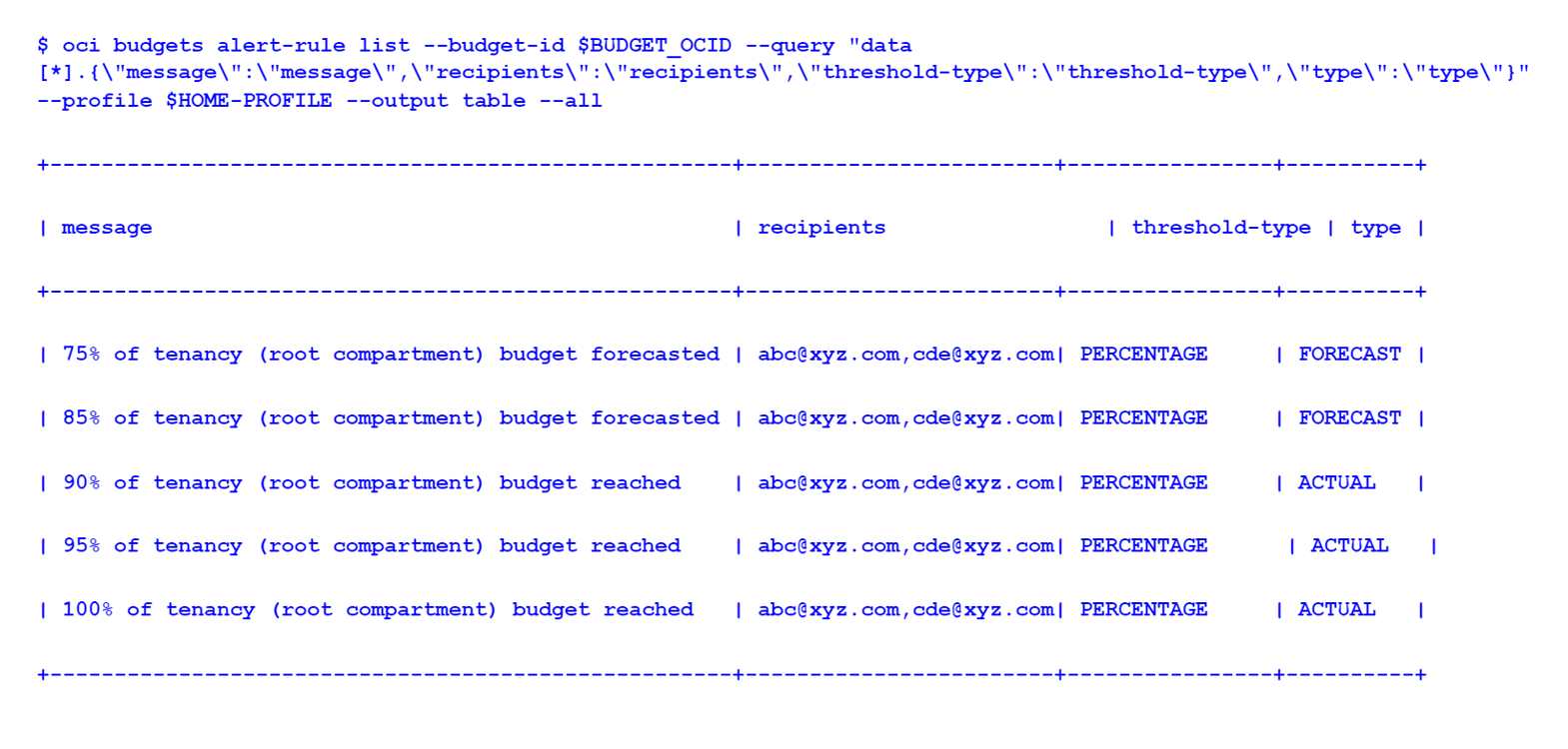 $ oci budgets alert-rule list --budget-id $BUDGET_OCID \