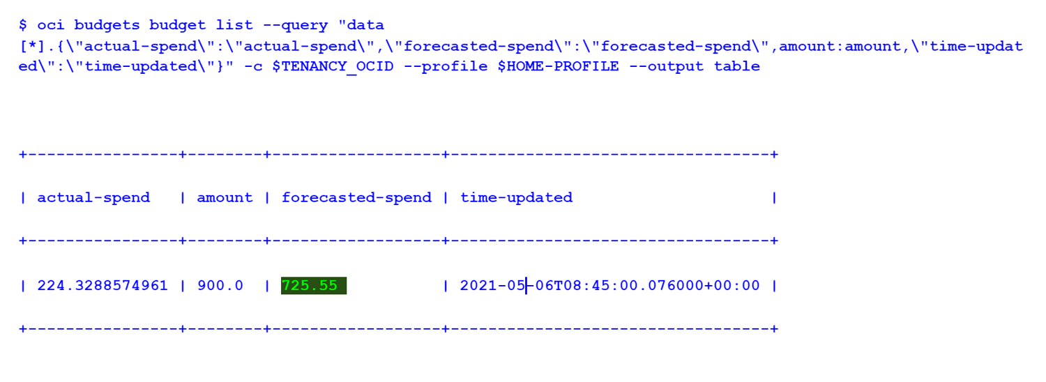 Below is how you can identify your current costs using the OCI CLI. Let’s assume the configured budget is $900; the forecast below is within the configured budget: