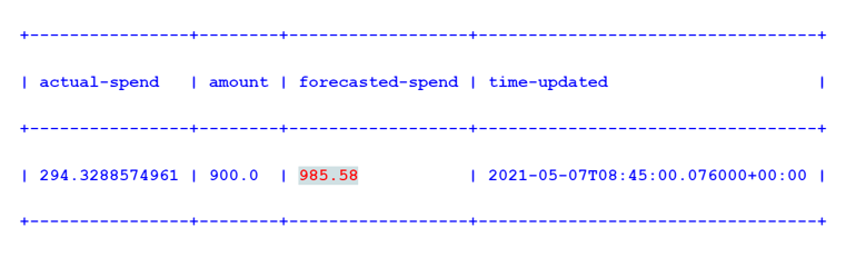 --query "data [*].{\"actual-spend\":\"actual-spend\",\"forecasted-spend\":\"forecasted-spend\",amount:amount,\"time-updated\":\"time-updated\"}" \